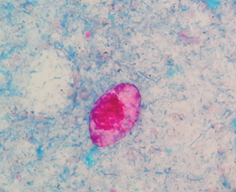 Hombre de 26 años con TARGA, profilaxis con cotrimoxazol y tratamiento para tuberculosis ingresó con diarrea persistente, afebril, palidez ligera y pérdida de 10 kg en mes y medio. Presentaba signos vitales normales, PA de 100/60 mmHg, peso de 36 kg y hemograma sin alteraciones. Fue tratado con metronidazol IV y el coprológico con Ziehl-Neelsen modificado mostró lo siguiente. Identifique el parásito (género y especie) y la forma evolutiva observada: