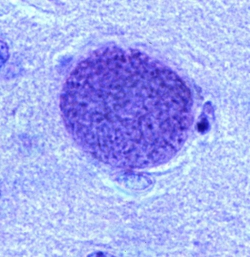 Muestra de un corte histológico del cerebro de un paciente inmunosuprimido. La estructura mide aproximadamente 60 micras de diámetro. Identifique al parásito (género y especie) y formas evolutivas dentro del quiste: