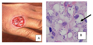 Hombre de 33 años consulta por lesiones en la mano. Mencione el nombre de la enfermedad (especificar presentación clínica de la enfermedad) y las formas evolutivas encontradas si se realiza una biopsia: