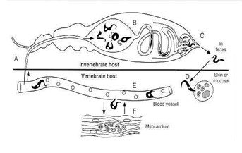 Un microbiólogo de los CDC estaba revisando cajas de de patología de tejido cardíaco de Tripanosomiasis americana. ¿Cuál es el parásito implicado(género y especie) y objetos observados en la imagen?
