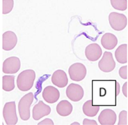 Una estudiante de posgrado de 29 años en Zoología realizó una expedición para observar a los gorilas de tierras bajas en la República Democrática del Congo. Durante el viaje reportó numerosas picaduras de insectos. Aproximadamente una semana después de regresar a casa desarrolló fiebre. Un mes más tarde comenzó a experimentar cefaleas, prurito en la piel y linfadenopatía, por lo que buscó atención médica. Se recolectó una muestra de sangre, se prepararon extendidos y se tiñeron con Wright-Giemsa. Los objetos mostrados en la Figura D fueron observados en cantidad moderada. ¿Cuál es su diagnóstico: nombre de la enfermedad, género, especie y subespecie (si fuera el caso)?