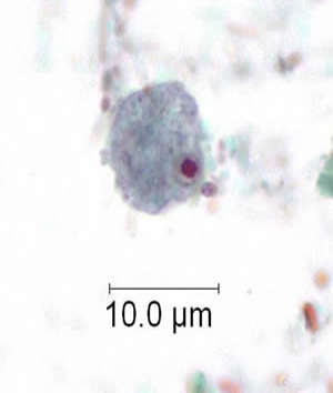 Identifique al protozoo que se encontró en una muestra de heces y mide de 15 a 25 um.