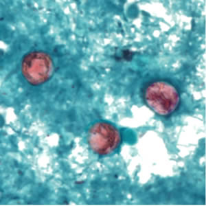 Identifique lo que se encontró en una preparación alcohol ácido resistente en la muestra de heces, encontrándose objetos que oscilaban entre 8 a 10 micras de diámetro, eran redondos: