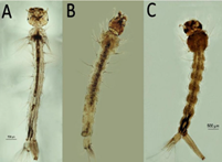 Identifique cuál es la larva de Anopheles, de acuerdo a las letras que poseen en la fotografía:
