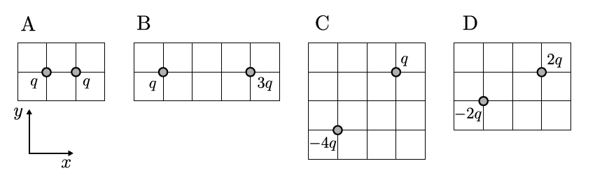 En cada uno de los casos A-D que se muestran a continuación, dos cargas puntuales se encuentran fijas en cuadrículas idénticas (todas tienen el mismo espaciado). El valor de es el mismo en todos los casos. ¿Cuál de las siguientes relaciones se da entre las magnitudes (módulos) de las fuerzas que se ejercen mutuamente las cargas?