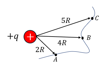 Si el potencial eléctrico en el punto de la figura es V. Determine el potencial eléctrico en los puntos y .