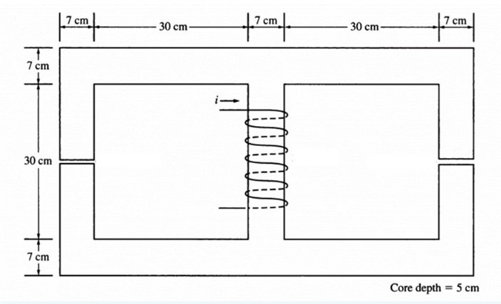 Considere o núcleo ferromagnético com uma permeabilidade relativa de 1500 da figura. As dimensões são as mostradas no diagrama e a profundidade do núcleo é de 5 cm. Os entreferros nos lados esquerdo e direito do núcleo medem 0,050 cm e 0,070 cm, respetivamente. Admita que devido ao efeito de espraiamento/dispersão, a área efetiva dos entreferros é 5% maior do que o seu tamanho real. A bobina possui 100 espiras enroladas em torno do braço central do núcleo com corrente de 15 A. Nestas condições determine a densidade de fluxo, B, para o braço esquerdo do núcleo magnético.