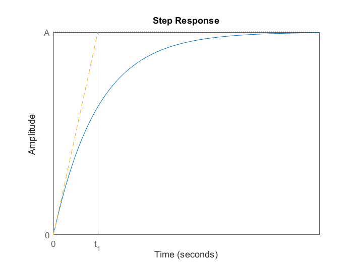 Um sistema de primeira ordem, cuja função de transferência é , tem a seguinte resposta ao degrau unitário, com e .