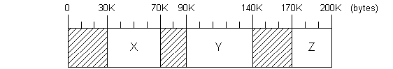 Considere um sistema multi-programado com partições variáveis. Em dado instante, o estado da memória principal é o representado na figura, onde X, Y e Z são buracos ( holes). Supondo que a gestão da memória é feita através de uma lista ligada, qual seria o buraco escolhido pelo algoritmo best fit para carregar um programa com a dimensão de 32Kbytes ?