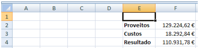 Faça uma macro/sub-rotina chamada resultado que solicite ao utilizador um valor de proveitos e um valor de custos e produza um resultado semelhante ao apresentado na folha de cálculo representada abaixo. A macro deverá escrever tudo o que aparece na folha de cálculo nas células representadas.