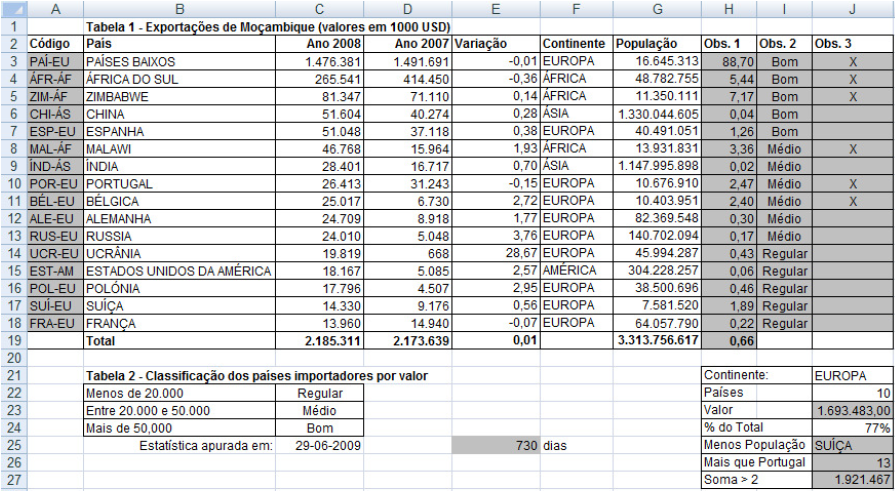 Considere a folha de cálculo Excel apresentada em anexo, que contém uma tabela com os 16 países que mais importações fizeram a Moçambique em 2008.
