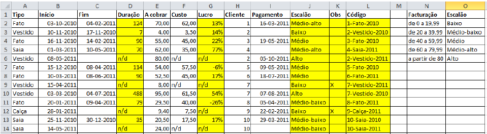Considere a folha de cálculo Excel apresentada abaixo, que contém uma tabela com os trabalhos realizados por um atelier de costura.