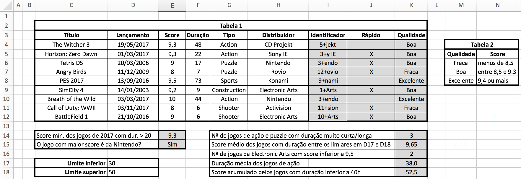 Apresente a fórmula a colocar em K15 que permite calcular o “Score” médio dos jogos cuja “Duração” se encontre no intervalo definido pelos valores inscritas em D17 e D18, inclusive.