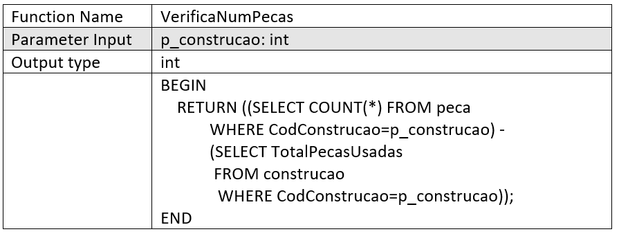 Se se executar [SELECT VerificaNumPecas(3)], o que retorna?