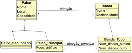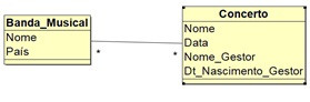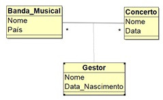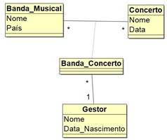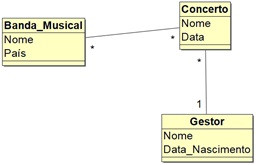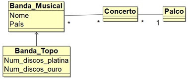 Considere o diagrama de classes abaixo. Se se pretender que um concerto possa decorrer em vários dias consecutivos, uma solução adequada seria incluir 2 atributos com a data de início e a data de fim na classe “Concerto”. Depois de introduzir esta alteração no modelo abaixo, já é possível saber que banda atua em cada dia.