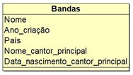 Pretende-se guardar informação sobre bandas musicais, incluindo o nome, ano de criação, e país de origem. Pretende-se ainda que fique registada informação sobre o cantor principal da banda, como o seu nome e data de nascimento. Com a representação abaixo, o mesmo cantor pode ser cantor principal em várias bandas.