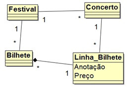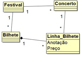 Uma empresa vende bilhetes para festivais, sendo que cada um pode incluir vários concertos. Pretende guardar (para além de informação sobre o festival e respetivos concertos) a informação impressa em cada bilhete, em que cada linha inclui o concerto pago bem como anotações várias por concerto que podem ser adicionadas pelo vendedor (por exemplo, aplicado desconto específico do dia para esse concerto). Indique qual das seguintes opções é a mais apropriada para representar o modelo através de um diagrama de classes.