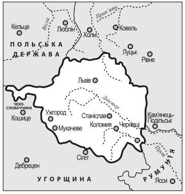 Українські землі, окреслені на картосхемі жирною лінією, увійшли до складу УНР в результаті