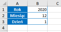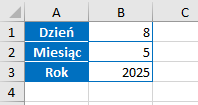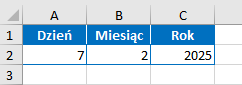 W załączonym wycinku arkusza znajdują się informacje o numerach: dnia, miesiąca i roku. Jaką formułę należy wpisać, aby otrzymać z nich datę.