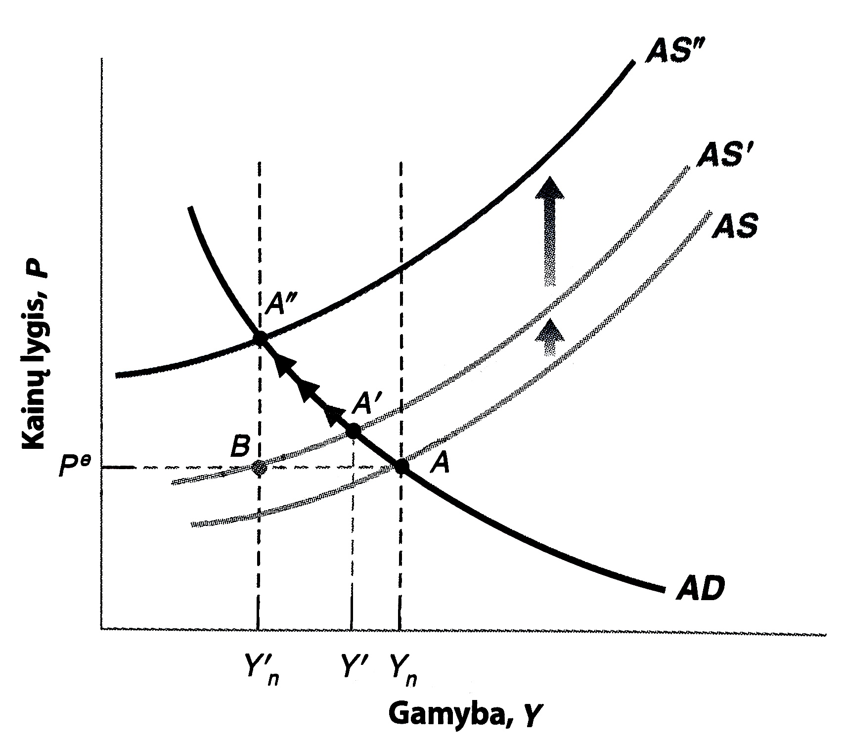 Remdamiesi paveikslu, a) pakomentuokite kaip didėjančios naftos kainos paveikia gamybą (Y) ir kainų lygį (P) trumpuoju ir vidutiniu laikotarpiais. b) Kaip naftos kainų pokyčiai veikia nedarbo lygį, maržą, kodėl?