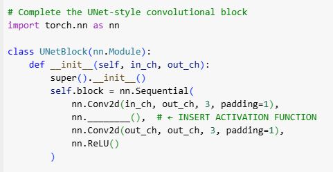 Which activation function should replace the blank to activate outputs of the first convolution layer in a UNet block?