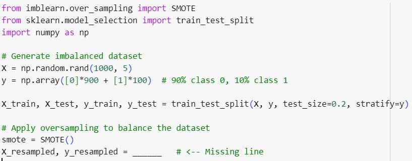Which code snippet should replace ______ to correct the dataset imbalance?