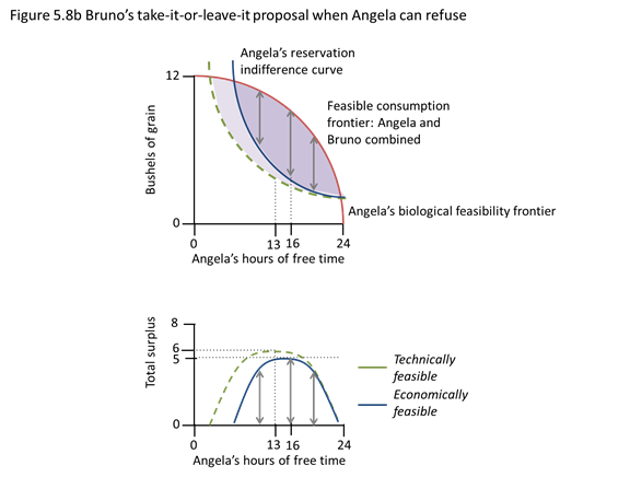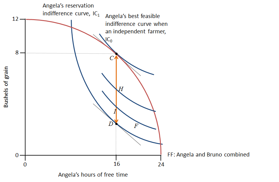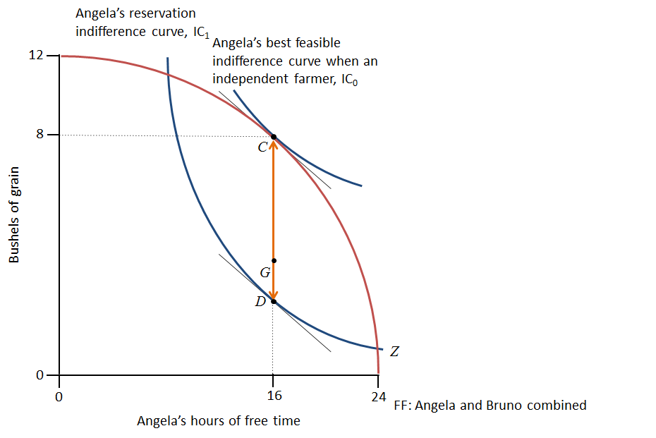 The figure below shows Angela and Bruno’s feasible frontier, Angela’s biological survival constraint and her reservation indifference curve.