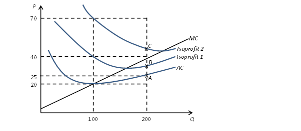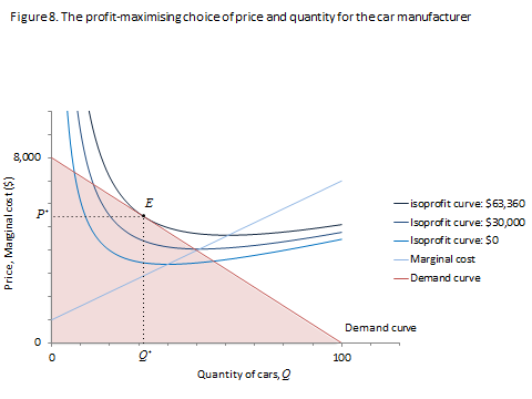 The following figure depicts the demand curve for Beautiful Cars, and the marginal cost and isoprofit curves of the car manufacturer.