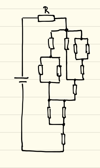 Im nebenstehenden Widerstandsnetz haben sämtliche Widerstände denselben Wert von R = 65 Ohm.