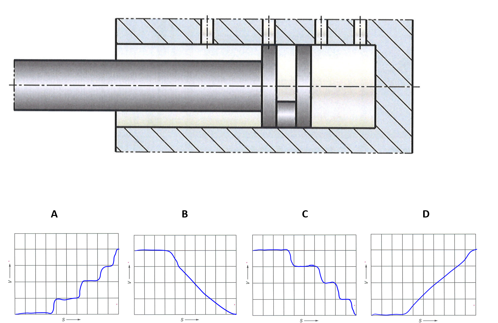 In einem hydraulischen Stossdämpfer bewegt sich der Kolben mit einer maximalen Kolbengeschwindigkeit zurück. Durch die Bohrungen kann das Öl in einen Ausgleichsraum fliessen. Welches Diagramm zeigt den ungefähren Geschwindigkeitsverlauf des Kolbens an?
