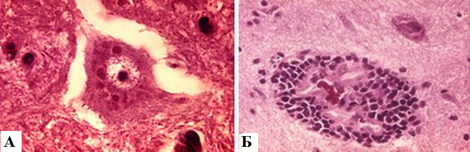 В умовах сертифікованої ветлабораторії за мікроскопії патогістологічних препаратів із зразків головного та спинного мозку загиблої лисиці, яка покусала домашнього собаку, виявили: гіперемію, набряк, набухання, петехіальні геморагії; у зразках головного мозку - вогнища проліферації лімфоцитів, клітин мікроглії навколо нейронів, кровоносних судин, у цитоплазмі деяких нейронів - щільні, овальної (рідше - веретеноподібної) форми тільця-включення (рис. 1.). Встановіть діагноз.