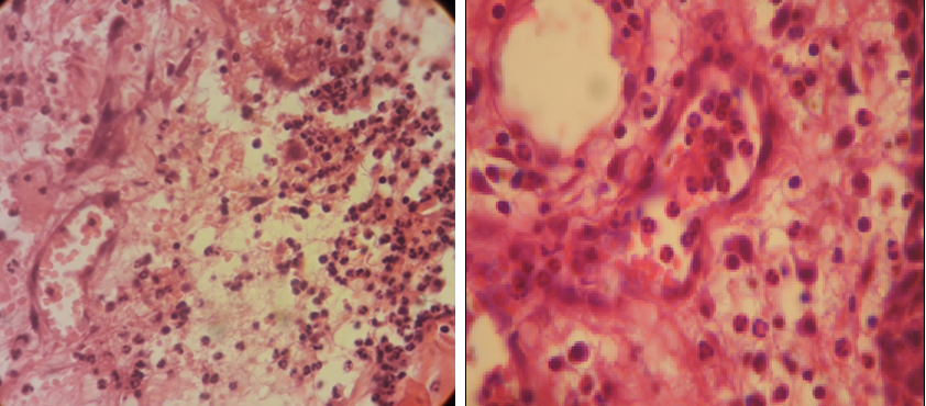 Рис. 1. Явища лейкопедезу з утворенням ексудату у вогнищі гострого запалення. Гістозріз, підслизова оболонка кон'юнктиви, г+е.