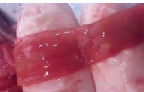 Рис. Фрагмент дванадцятипалої кишки голуба (вигляд з боку слизової оболонки):з гладження рельєфу, почервоніння, набряк слизової оболонки, потовщення стінки.