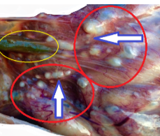 Рис. Гранульоми на очеревині курки (стрілки в червоних овалах); жовтий овал – жовчний міхур.