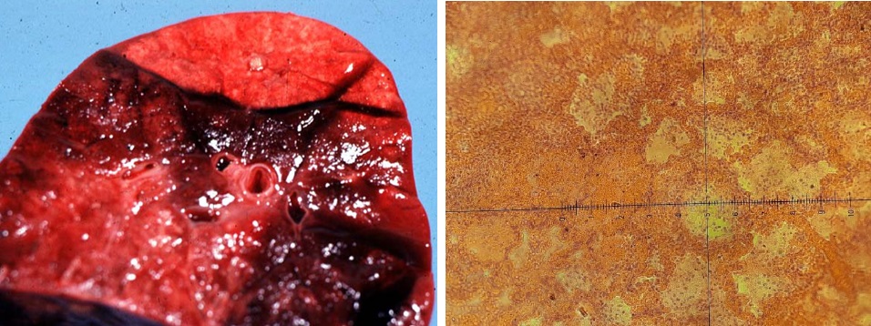 Рис. 1. Крупозна пневмонія. Макрофото: легеня на розрізі; мікрофого: гістозріз фрагменту легень, г+е.