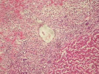 За патоморфологічного дослідження печінки загиблого дога встановлено, що орган збільшений в обсязі, має напужену капсулу та закруглені краї, його поверхня строката (блідо-сірого та сіро-жовтого кольору з темно-червоним крапом), консистенція щільна. На гістопрепараті зразка печінки видно розширення та повнокров'я центральних вен та синусоїдів; на периферії знаходяться гепатоцити із жировою або зернистою дистрофією (рис.1.). Класифікуйте патологію.
