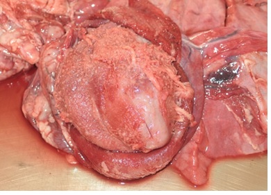 Макропрепарат серця свині. Має місце дифузна шорсткість поверхні епікарду та перикарду (осердя) - вони вкриті нитками фібрину; листки осердя потовщені, між ними є скупчення сіруватого кольору щільних нашарувань, тяжів, які зв'язані із епікардом (рис.1.). Оберіть ймовірний діагноз описаної патології.
