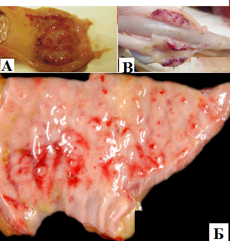Вкажіть, яке із нижченазваних захворювань птиці характеризується, окрім інших патологій, розвитком геморагічного синдрому з локалізацією крововиливів у слизовій оболонці на межі залозистого та м'язового шлунку (рис. 1.), у ділянці лімфоїдних утворень сліпих кишок?