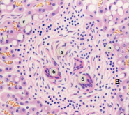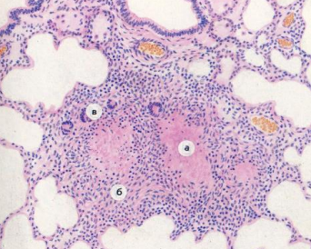 Рис. 1. Гістозріз легень, будова молодої (праворуч) та зрілої (ліворуч) туберкульоми