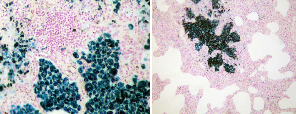 Легені коня-продуцента сироваток іржавого кольору, який обумовлений значним накопиченням гемосидерину в альвеолах і стромі. Встановлено, що у тварини була хронічна серцева недостатність: за рахунок пошкодження ендокарду, клапанів та міокарду стінки лівого шлуночку останній був неспроможним перекачати кров із малого - у велике коло кровообігу. Праве серце нагнітало кров у легені, а ліве – було неспроможним її відкачати. Капіляри легень переповнювалися кров'ю, розширювалися, зростала проникність їх стінки. Еритроцити шляхом діапедезу проникали з просвіту судин у легеневу тканину (у альвеоли). Еритроцити поза просвітом судин гинули та фагоцитувалися макрофагами з утворенням гемосидерину (він має світло-коричневе / іржаве забарвлення. Макрофаги з гемосидерином називаються сидерофагами ("клітинами серцевих вад"). Консистенція легень щільна внаслідок розвитку пневмосклерозу, генез якого пов'язаний із проліферацією фібробластів та їх активізацією внаслідок гіпоксії. Назвіть описану патологію та методику її гістохімічної діагностики за наведеними рисунками.