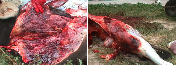 Рис. 1. Емфізематозний карбункул у корови, некропсія. Макрофото.
