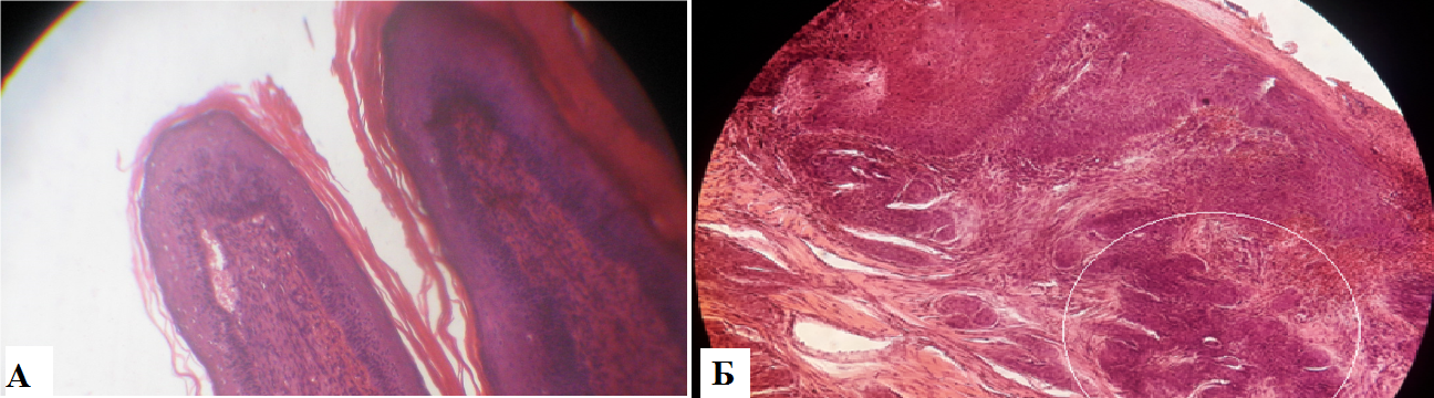 2 - пухлину, що розташована у епідермісі та глибоко проникає у дерму, підшкірну клітковину; з вираженою клітинною та тканинною атипією (рис. 1.Б), трансформований епітелій базального шару утворює у дермі вогнища (комплекси).
