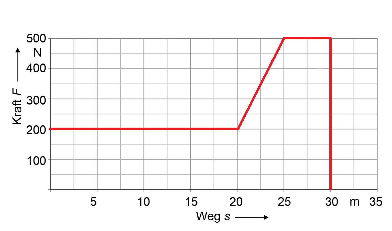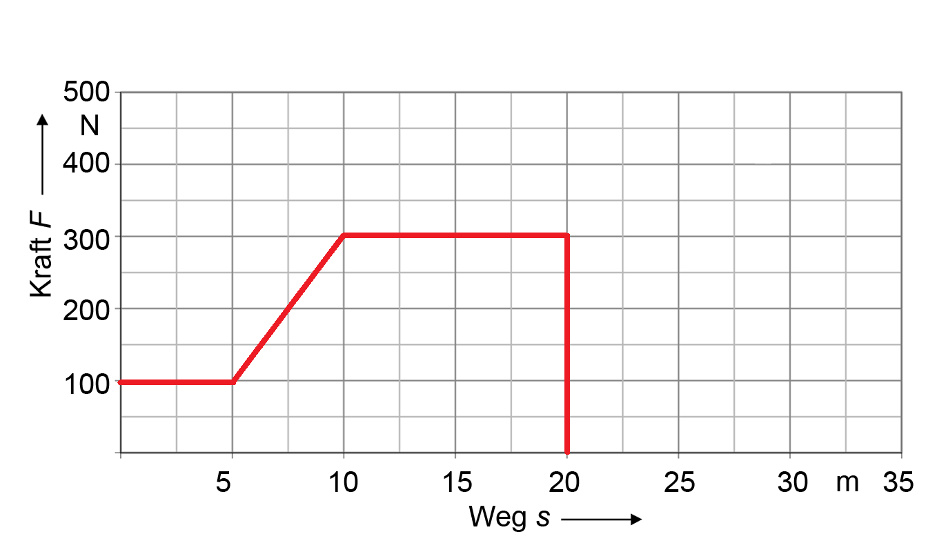 Ein Vorgang hat diesen Verlauf im Kraft – Weg – Diagramm:Hinweis: Sie dürfen einen vereinfachten Lösungsweg (ohne Formel) notieren.