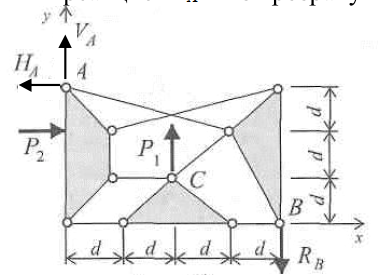 Визначити реакцію НА в'язі розрахункової схеми споруди, якщо d=2 м, Р1=20 кН, Р2=40 кН.