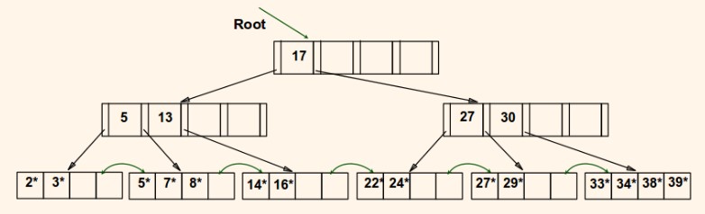True/False: Consider the following is a variant of a B+ tree with parameter n=4 which is slightly different from what we considered in class in that a pointer to the right of a key x includes records with keys x. Suppose we delete the record with key 27. Then we merge the leaf nodes with keys {29} and {22, 24} into a single leaf node.