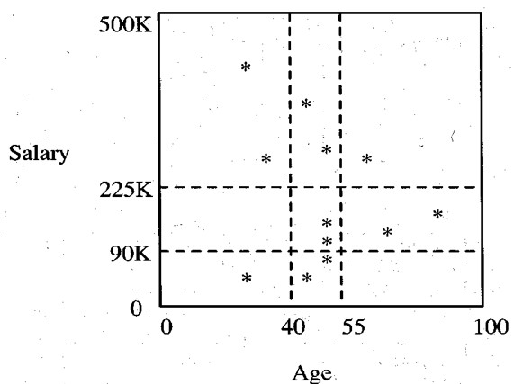 Consider the following kd-tree index on table (Age,Salary). Suppose a search query uses this index to find the records with age=55. How many leaf nodes will be returned as a query result? Your answer is of type integer, like 6521.