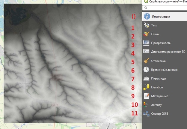 Перед вами візуалізація шару ЦМР «relef» та його складові функції «Властивості шару»