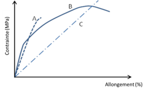 La figure ci-dessous schématise les courbes de traction de 3 matériaux A, B et C