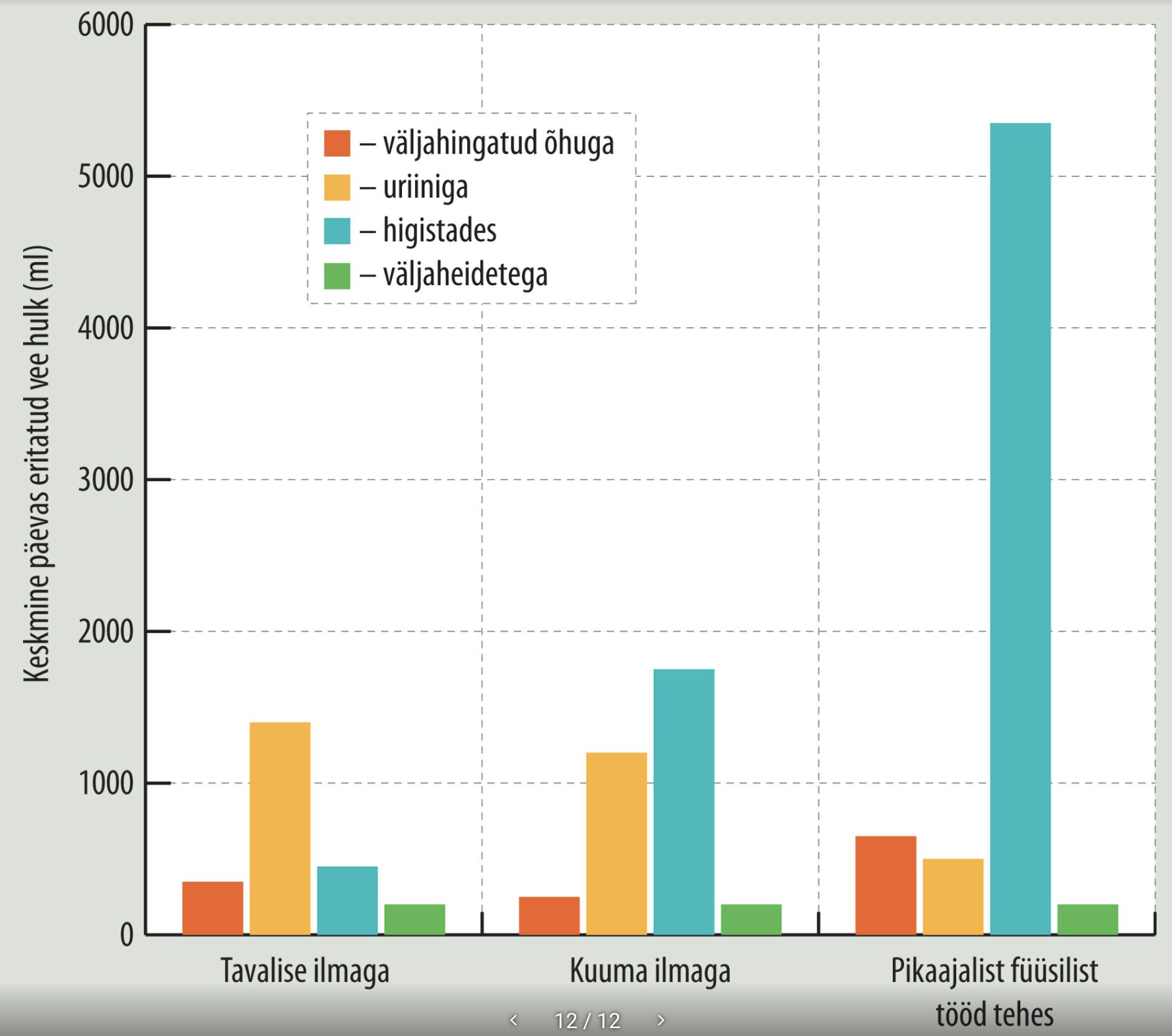 Uuriti inimese erinevate erituselundite osa vee eritamisel. Diagrammil on andmed ühe inimese vee-erituse kohta eri tingimustes.