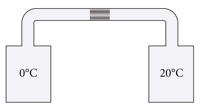 Kaks ühesugust vesinikuga täidetud anumat on ühendatud horisontaalse toruga, mille keskel on elavhõbedasammas. Ühes anumas on gaas 0 °C, teises aga 20 °C juures (vt joonis). Kas elavhõbe torus nihkub, kui mõlemat anumat soojendada 10 °C võrra?